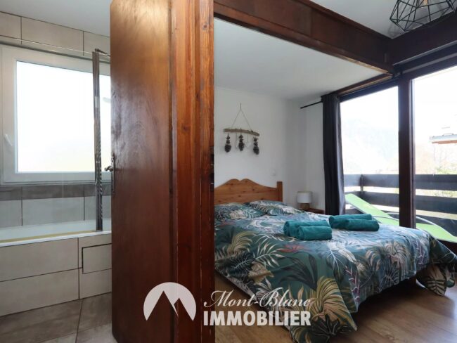 Un dégagement/couloir avec placard dessert une grande pièce de vie comprenant un séjour, une salle à manger et un coin cuisine semi-ouvert. Le séjour donne accès à un grand balcon orienté Est, offrant une belle vue sur l’Aiguille du Midi. Les deux chambres doubles disposent de placards intégrés et d’un balcon : l’un orienté Est avec vue sur les Aiguilles de Chamonix, l’autre sur l’Aiguillette des Houches.